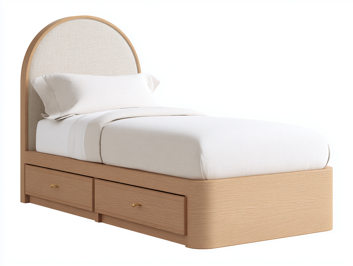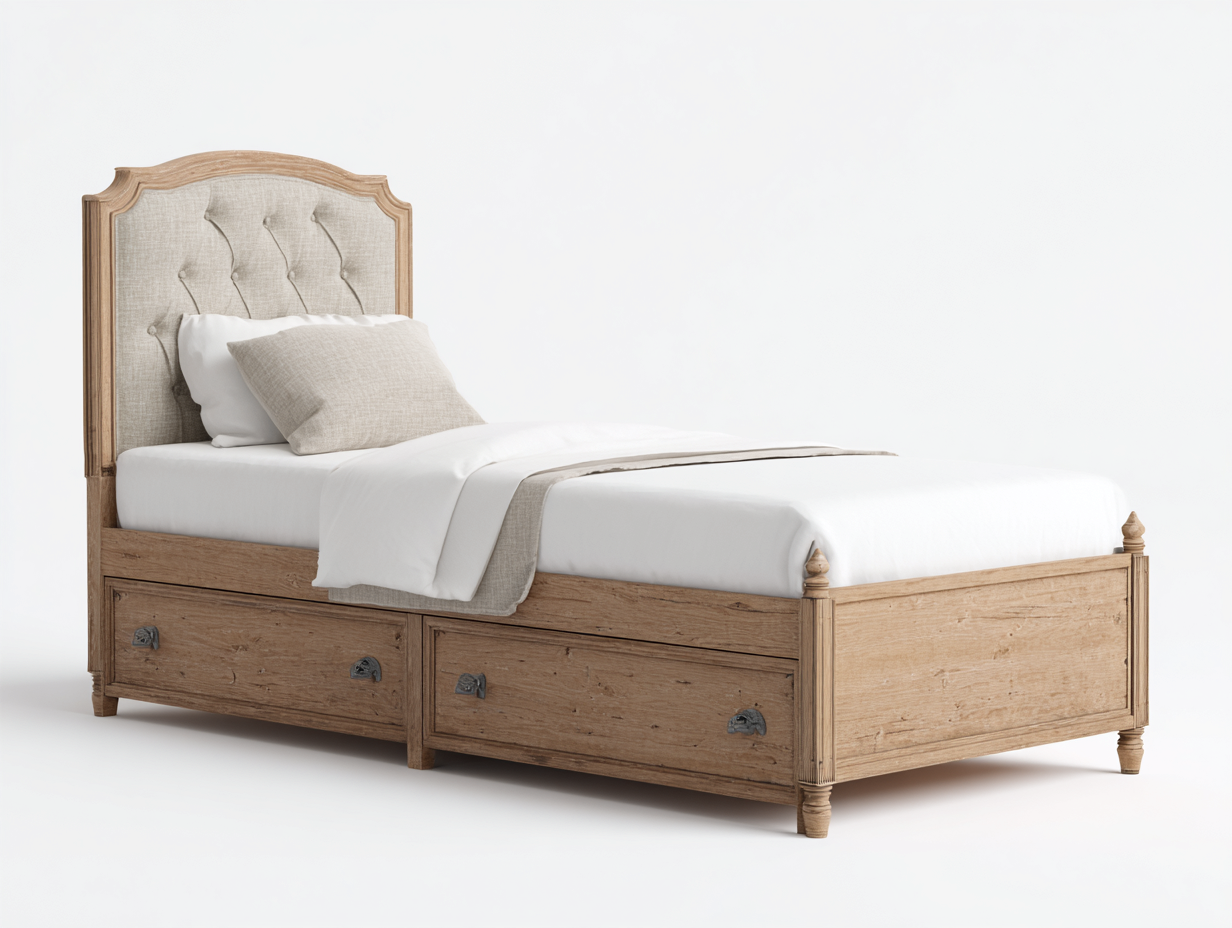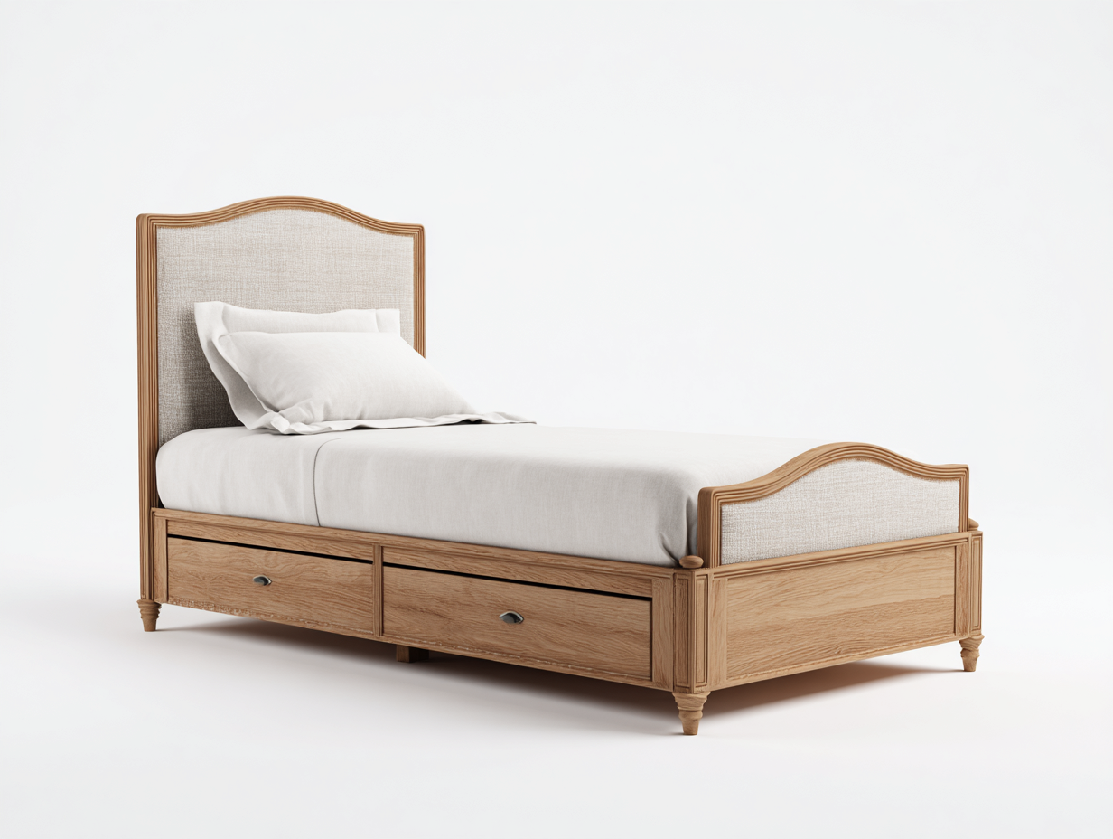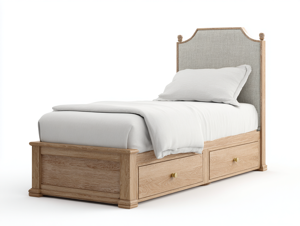 Einzelbett Massivholz mit Stoffkopfteil und Schubladen 205x105x110 cm - Eiche Natur - Klassisches Design - Geeignet für Schlafzimmer