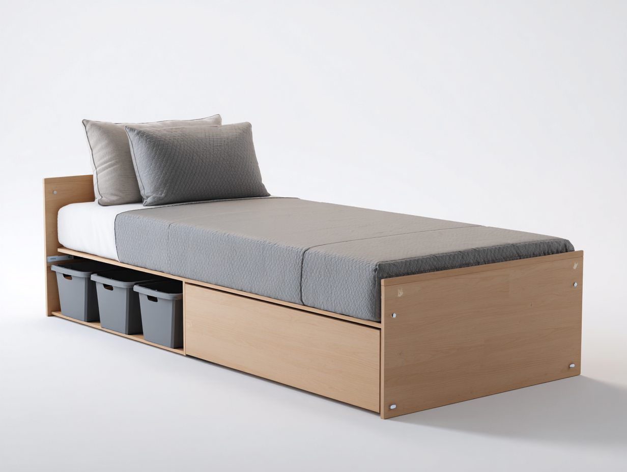 Dieses Einzelbett bietet eine praktische und komfortable Schlaflösung für Schlafzimmer, Gästezimmer oder Jugendzimmer. Die klare Linienführung und die natürliche Holzoptik sorgen für ein ruhiges und modernes Erscheinungsbild. Durch die integrierte Aufbewahrung unter der Liegefläche eignet sich das Bett besonders für Räume, in denen zusätzlicher Stauraum sinnvoll genutzt werden soll.